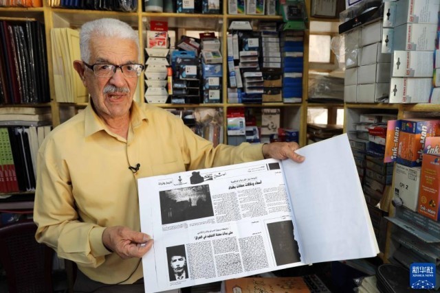 4月19日,在伊拉克首都巴格达,“阿斯里”书店的前老板法卢吉介绍店面早期情况。新华社发(哈利勒·达伍德 摄)