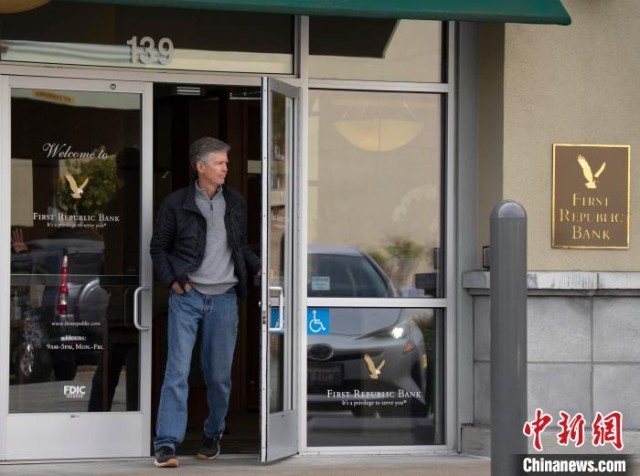 当地时间5月1日,一名男子走出位于美国加州米尔布雷市的一家第一共和银行。 中新社记者 刘关关 摄