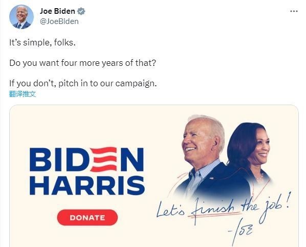CNN注意到,在特朗普的直播结束后不久,美国总统拜登在社交媒体上发出了政治筹款呼吁,并配文称,“很简单,伙计们。 你还想再那样过四年吗?如果你不喜欢,请参与我们的竞选活动。”