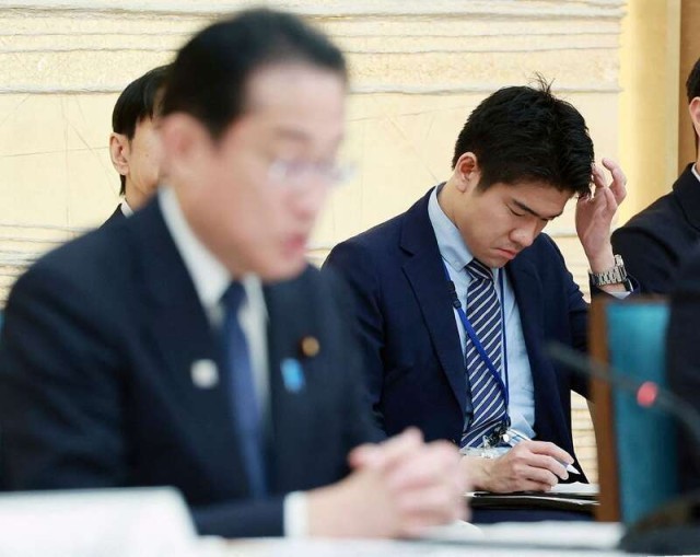 5月15日,日本东京,首相岸田文雄的儿子岸田翔太郎(右)在首相办公室参加会议。图片来源 视觉中国