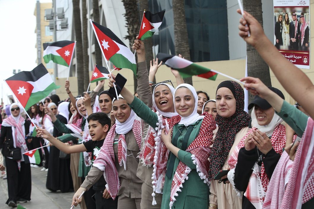 6月1日,约旦安曼,民众挥舞着国旗,等待皇家车队驶来。