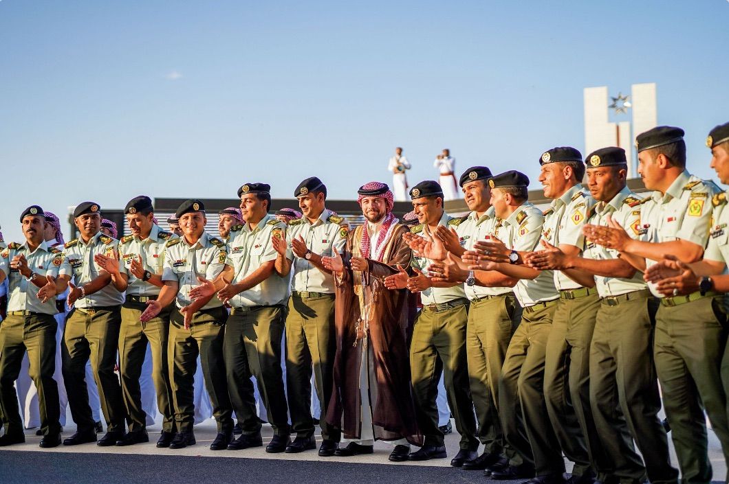 5月31日,约旦安曼,侯赛因王储(中)与约旦武装部队成员一起跳民俗舞蹈。