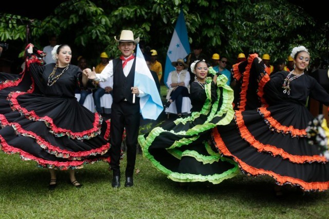 5月30日,舞蹈演员在洪都拉斯圣芭芭拉省圣克鲁斯市洛斯纳兰霍斯公园表演民俗节目。新华社发(卢西奥·塔沃拉摄)