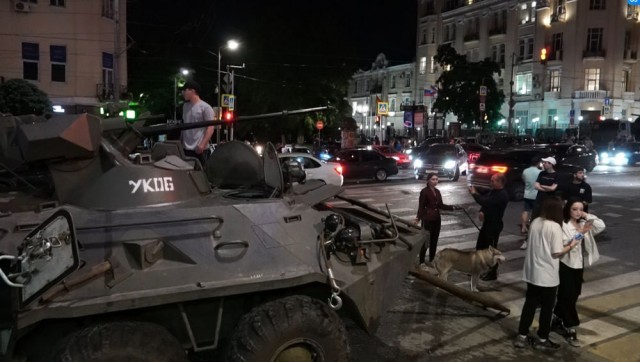 6月24日,在俄罗斯顿河畔罗斯托夫,当地居民站在装甲车旁(视频截图)。新华社发(弗拉基米尔摄)