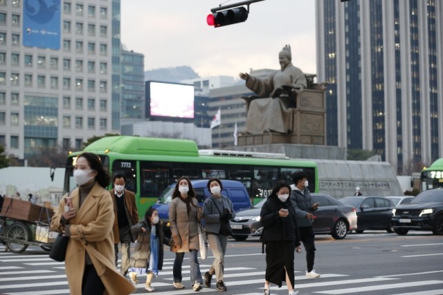 2021年11月29日,行人佩戴口罩在韩国首尔光化门广场过马路。新华社记者王益亮摄