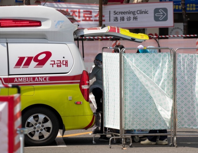 2020年3月4日,在韩国大邱庆北大学医院,医护人员从救护车上下来。新华社发(李相浩摄)
