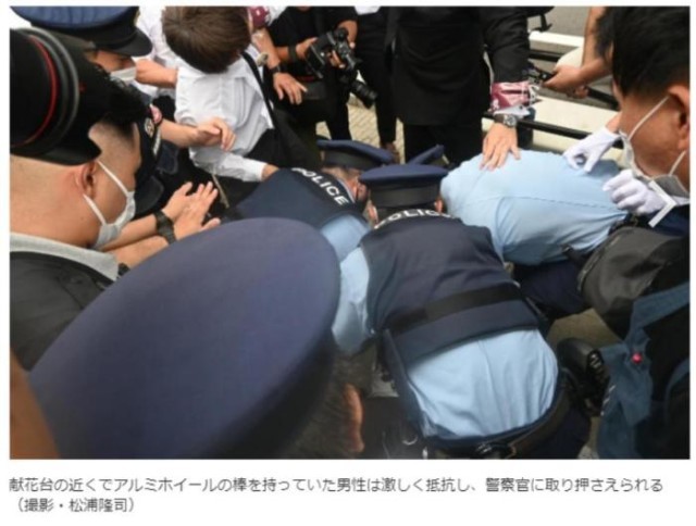当地时间8日上午,日本前首相安倍晋三遇刺一周年默哀仪式,在其遇刺地奈良大和西大寺车站前举行。活动中,一名男子手持“类似枪械的物品”靠近献花台,被警方带走。图片来源:日本《日刊体育》网站报道截图