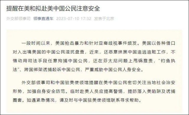 10日,中国外交部“领事直通车”微信公众号发布消息,提醒在美和拟赴美中国公民注意安全。该消息指出,一段时间以来,美国枪支暴力和针对亚裔歧视事件频发,美国以各种借口对入出境美国的中国公民滋扰盘查,近来还恶意抹黑中国追逃追赃工作,不惜动用司法手段任意拘捕中国公民,还在芬太尼问题上甩锅推责,“钓鱼执法”、跨国绑架诱捕起诉中国公民,严重威胁中国公民人身安全。“外交部领事司和中国驻美使领馆提醒在美中国公民密切关注当地社会治安形势,加强自身安全防范。临时赴美人员应提高警惕,提防落入美陷阱及诱捕圈套。”11日,“中国驻美大使馆”微信也推送了相关消息。