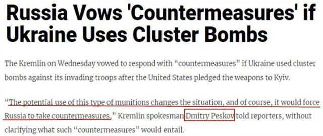 俄罗斯总统新闻秘书佩斯科夫则回应称:“毫无疑问,集束弹药一旦投入使用,将对局势的变化产生影响。俄罗斯将不得不针对乌克兰的这一行为采取相关反制措施。”