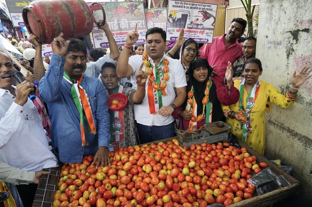 7月13日,印度孟买,印度国大党成员高喊口号,抗议西红柿等生活必需品价格飞涨。图片来源 视觉中国