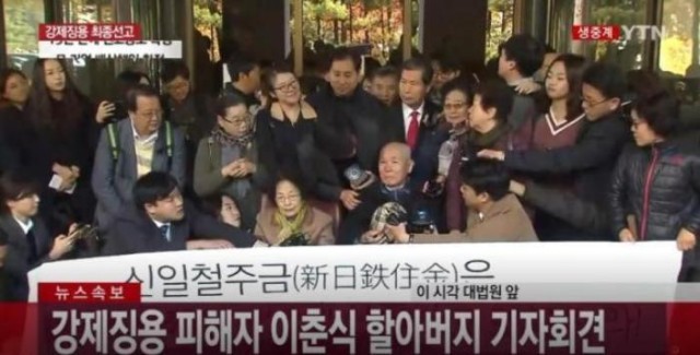 2018年10月30日,韩国最高法院判定相关日本企业向4名二战期间被日方强征的韩国劳工每人赔偿1亿韩元。4人中唯一在世的94岁韩国老人李春植召开记者会发表感想。图片来源:韩国YTN电视台视频截图