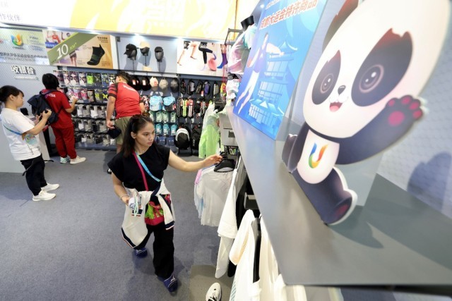 运动员在成都大运村内的特色商店选购。中国日报记者 魏晓昊 摄