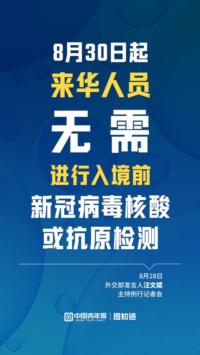 图知道|8月30日起,来华人员无需进行入境前新冠病毒核酸或抗原检测
