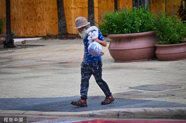 当地时间2023年8月30日,美国佛罗里达州,飓风“伊达利亚”登陆后,一名无家可归的男子在坦帕寻找避难所。