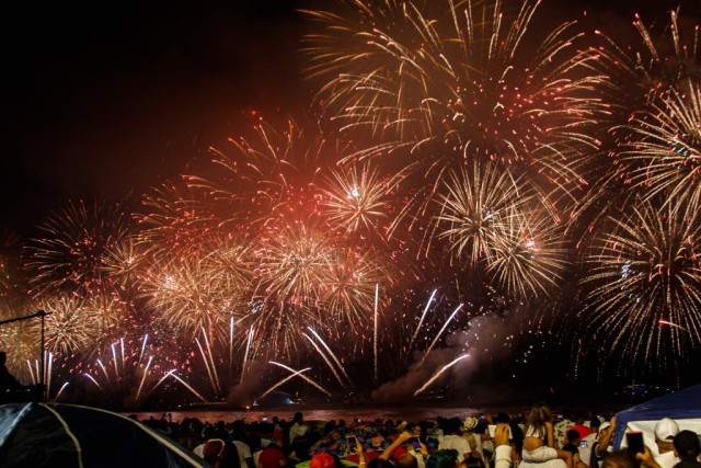 2024年1月1日凌晨,在巴西里约热内卢科帕卡巴纳海滩,人们观看焰火表演迎新年。新华社发(克劳迪娅·马尔提尼摄)
