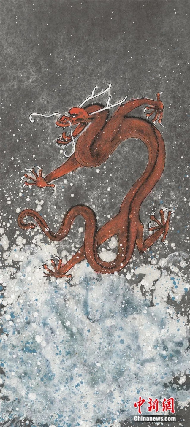甲辰大吉 王伯勋 98-38cm 纸本重彩 2024。国画书法成为展示中国龙符号的重要渠道。王伯勋供图