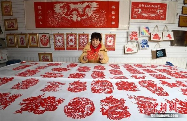 2月7日,河北省邯郸市复兴区民间剪纸艺人冯石萍在创作龙年剪纸作品。郝群英 摄