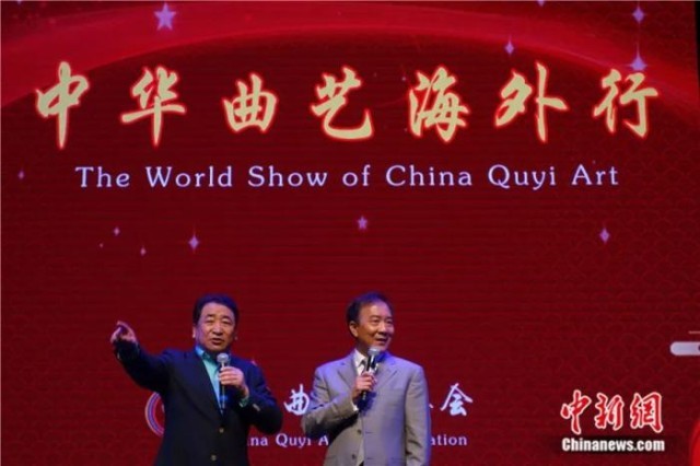 2019年3月18日晚,相声表演艺术家姜昆(左)和戴志诚在阿根廷布宜诺斯艾利斯星光大剧院表演相声。莫成雄 摄