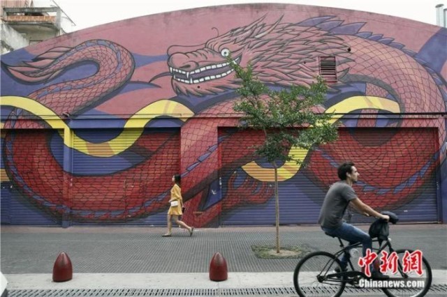 阿根廷首都布宜诺斯艾利斯“唐人街”上一家涂有巨龙图案的店铺。盛佳鹏 摄
