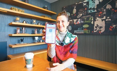 一名外籍人士在北京望京一家咖啡店内体验使用手机小程序预定公园门票。
