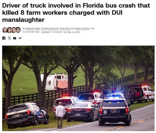 据报道,声明称,当天早上约6时35分,一辆载有53名农场工人的大巴与一辆皮卡车,在奥卡拉市(Ocala)以西约15英里处发生碰撞事故。