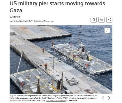 中新网5月16日电 据路透社报道,当地时间15日,一名美国官员表示,美军已开始将一个临时码头移向加沙海岸,并称这是美国总统拜登承诺启动海上港口以加快向加沙地带提供人道主义援助前的最后步骤之一。