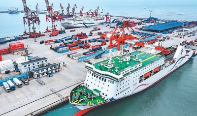 今年以来,山东省荣成市石岛管理区通过推广“海运直航+跨境电商+海外仓”等发展模式,全力做好货物承揽。图为日前,石岛新港口岸,货轮在装卸集装箱货物。