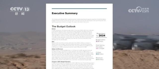 央视网消息:美国国会预算办公室18日发布报告称,在2024财年,联邦政府预算赤字预计将达到1.9万亿美元。