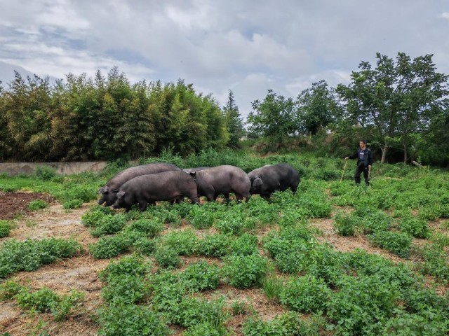 6月2日,云南老浦家火腿实业发展有限公司养殖的乌金猪在觅食。新华社记者 林碧锋 摄