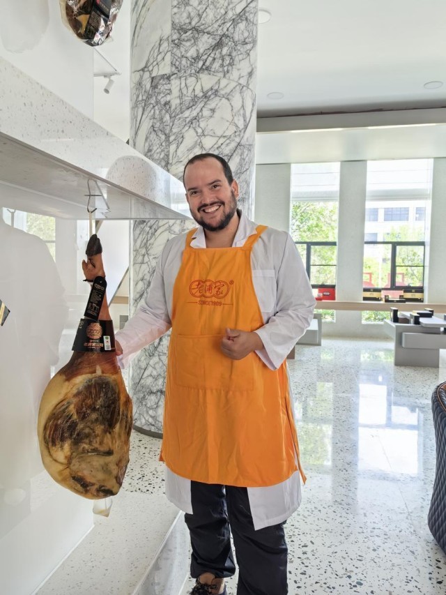 6月2日,新华社古巴籍记者塞尔希奥·戈麦斯在云南省宣威市手持火腿。新华社记者 李晔 摄