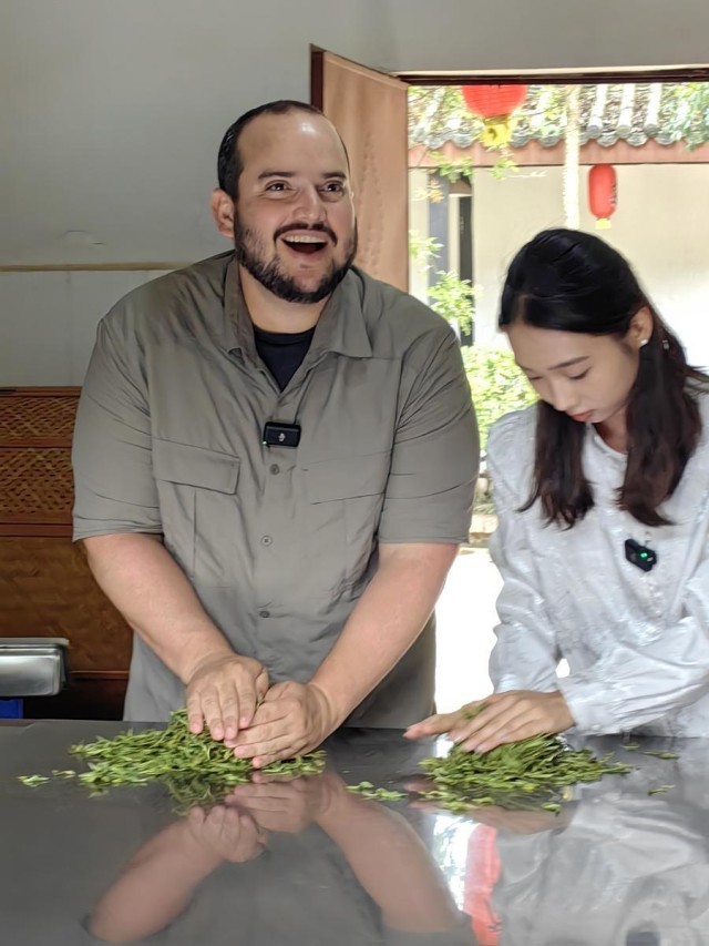 5月29日,新华社古巴籍记者塞尔希奥·戈麦斯(左)在云南省普洱市思茅区体验制茶。新华社记者 李晔 摄