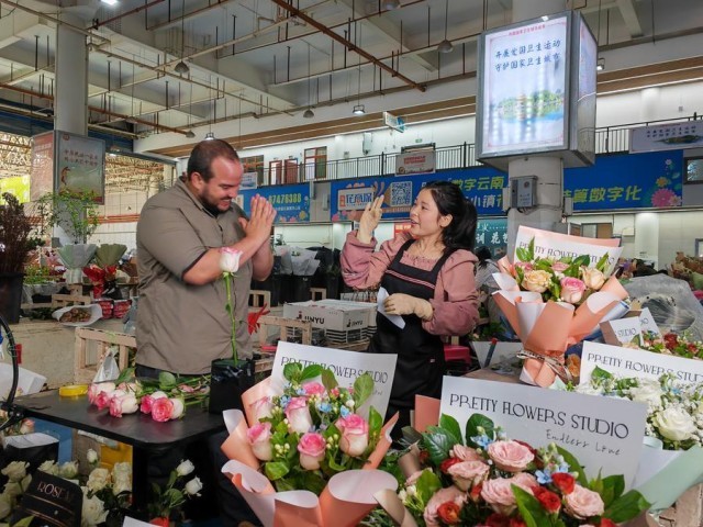 5月31日,新华社古巴籍记者塞尔希奥·戈麦斯(左)在昆明斗南花市与花商交谈。新华社记者 林碧锋 摄
