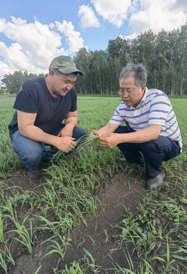 6月21日,西北农林科技大学张正茂教授(右)在哈萨克斯坦北哈州农业科技示范园与当地专家调查小麦苗情。新华社发(受访者供图)