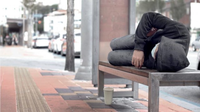 图为一名男子睡在街边的长椅上。图源:日媒