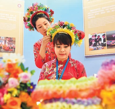 2月2日,两名女孩在2024中国—东盟人文交流年展览活动上展示福建蟳埔女头饰。