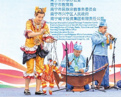 四月十二日,在第二届中国—东盟(南宁)非物质文化遗产周上,演员们进行非遗展演。