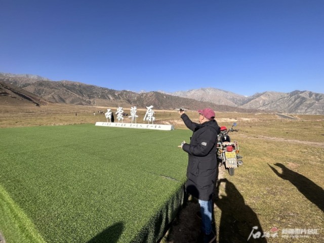 哥伦比亚籍自媒体创作者高飞觉得和盛夏草原浓烈的绿相比,秋日草原别有一番风味。石榴云/新疆日报 记者张小宓摄