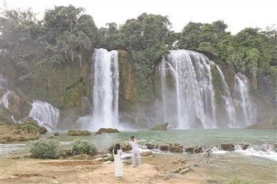 从越南首都河内驱车往东北方向行驶400多公里,一路经过星罗棋布的稻田,越过连绵不绝的原始丛林和崇山峻岭,最终抵达高平省重庆县潭水乡归春河畔,就能看到著名的中越德天(板约)跨国瀑布(见图二,本报记者杨晔摄)。10月14日,中越德天(板约)瀑布跨境旅游合作区宣布正式投入运营,成为中国首个跨境旅游合作区。近日,本报记者到此进行了实地探访。