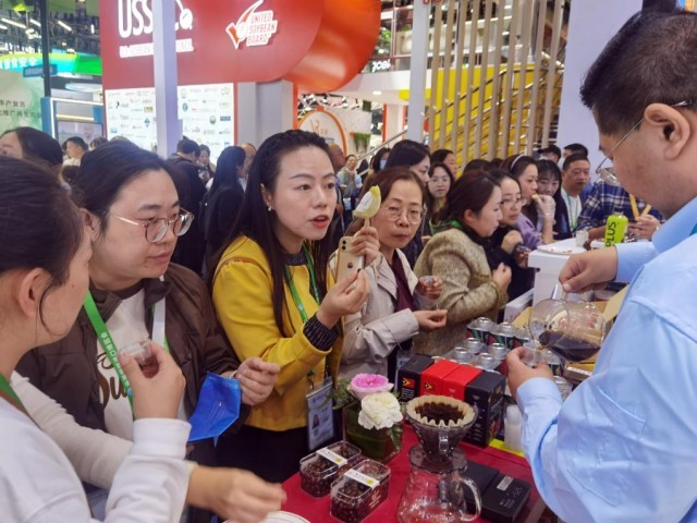 11月8日,采购商在东帝汶咖啡展位前驻足,一名参展方代表制作并介绍来自东帝汶的——“猫典”咖啡。 新华社记者 许晓青 摄