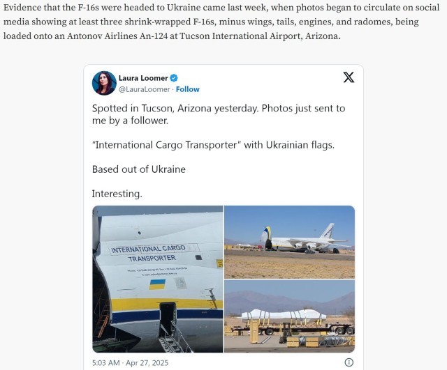 此前有美国媒体爆料称,至少有3架被拆卸的F-16战机机身被装载到乌克兰安-124运输机上。