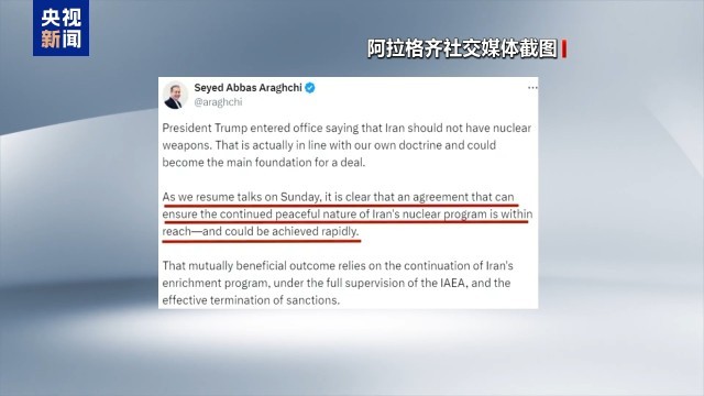 伊朗外长阿拉格齐11日在社交平台上发文说,伊朗与美国定于15日举行新一轮会谈,两国有希望达成协议,甚至“有可能迅速达成”。特朗普说伊朗不应拥有核武器,这实际上与伊朗自身的原则一致。他同时强调,要达成对双方都有利的协议,条件是伊朗能够在国际原子能机构全面监督下继续其铀浓缩项目,以及终止对伊朗的制裁。