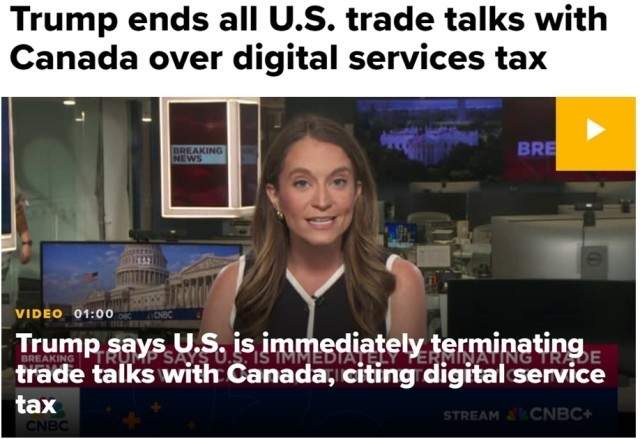 因不满加拿大将对包括美国科技公司在内的企业征收数字服务税,美国总统特朗普27日在社交媒体上宣布“立即停止”与加拿大的所有贸易谈判。