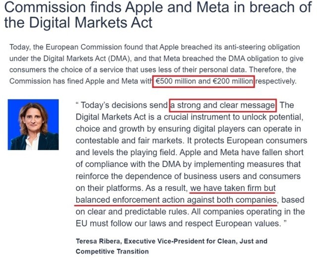 欧委会执行副主席兼竞争事务委员特蕾莎·里贝拉表示,这项罚款“传递出强烈且明确的信息”,那就是欧盟将“坚定但平衡地”实行数字监管。