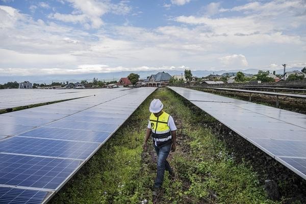 当地时间2025年5月23日,刚果(金)戈马,一公司技术员卡坦博·瓦兹瓦兹走过一处太阳能农场。视觉中国配图