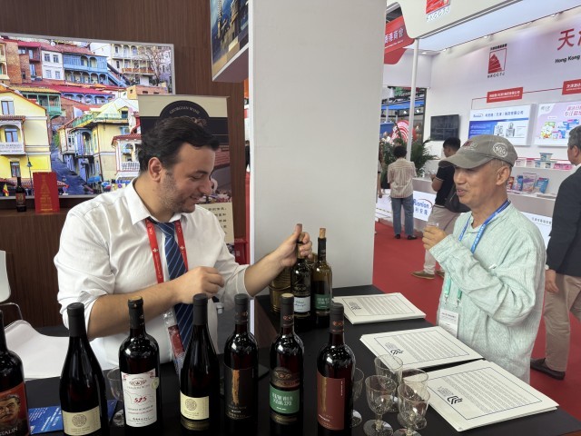 7月16日,北京,参加第三届中国国际供应链促进博览会的格鲁吉亚工商户代表星宇(左)和一位中国参展观众互动。马子倩/摄
