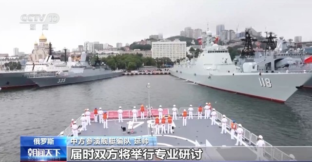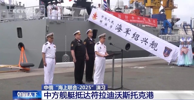 在俄罗斯符拉迪沃斯托克某军港码头,悬挂中俄两国国旗的中国海军舰艇编队缓缓抵靠。中俄双方联合导演部成员、中国驻俄大使馆武官处、当地总领事馆工作人员等到码头迎接。俄方总导演表示,中国海军在世界反法西斯战争胜利80周年之际抵达符拉迪沃斯托克,给这次联演赋予了特殊的意义。希望双方继续深化联合行动和友好互访,共同维护亚太地区海洋的宁静和安全。