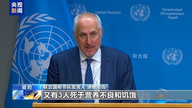联合国秘书长发言人 迪雅里克:我们人道主义事务协调厅的同事今天(26日)援引加沙地带卫生部门的一份报告称,在过去24小时内,又有3人死于营养不良和饥饿,使死亡人数总数达到303人,其中包括117名儿童。