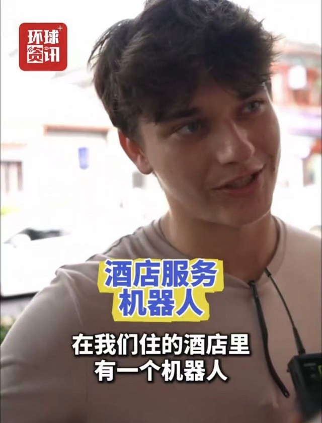 法国游客则体验了酒店里的送货机器人。