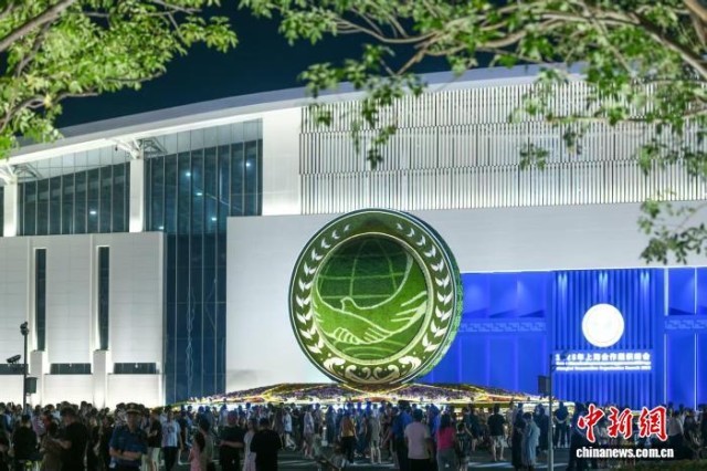 8月28日晚,天津梅江会展中心,“2025年上海合作组织峰会”会场外的主题花坛,吸引了不少市民前来打卡拍照,沉浸式感受上合峰会的浓厚氛围。中新社记者 佟郁 摄