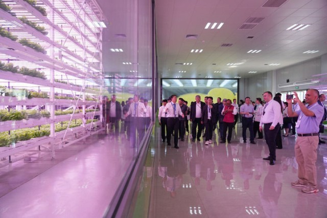 5月19日,上海合作组织减贫和可持续发展论坛与会人员在陕西杨凌智慧农业示范园进行实地考察。